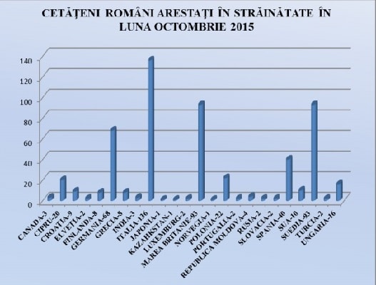Potrivit MAE, numărul cetăţenilor români arestaţi în străinătate în luna octombrie 2016, conform comunicărilor transmise de autorităţile străine către misiunile diplomatice și oficiile consulare ale României în străinătate, era de 879 persoane.